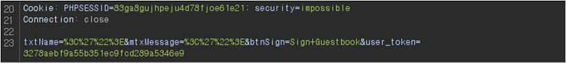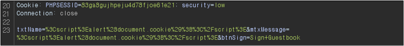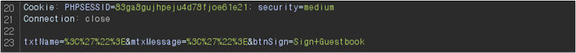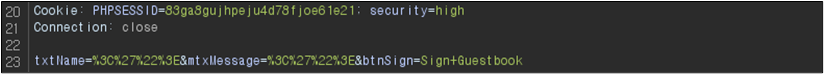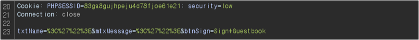 Low ๋ ๋ฒจ์ ๊ฒฝ์ฐ Name๊ณผ Message ๋ชจ๋์ XSS๊ฐ ๊ฐ๋ฅํ ๊ฒ์ ํ์ธํ ์ ์๋๋ฐ ์ด๋ฅผ Burp Suite๋ก ํ์ธํด๋ณด๋ฉด ๋ค์๊ณผ ๊ฐ๋ค.