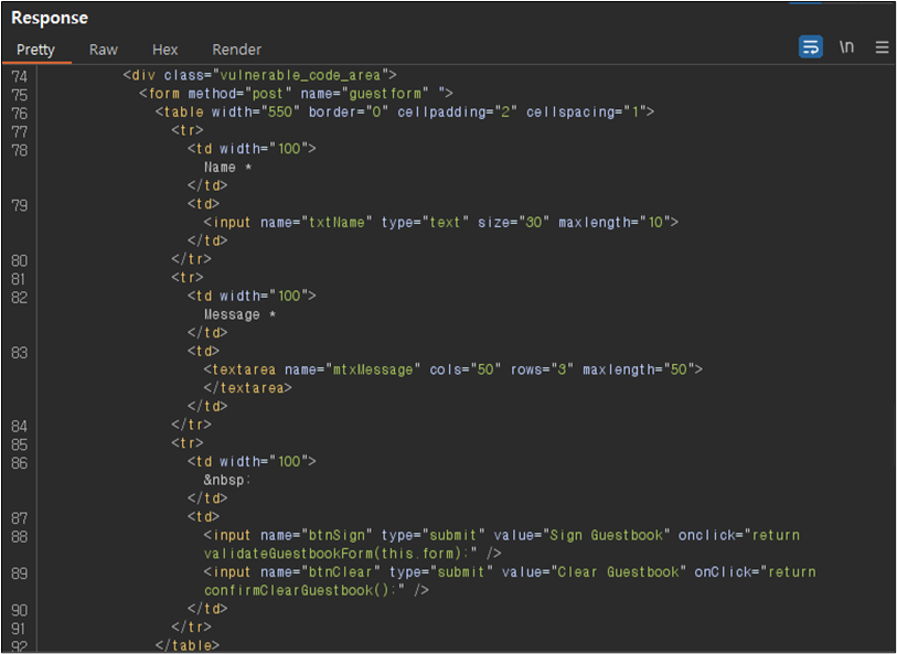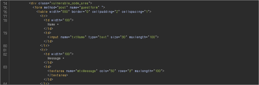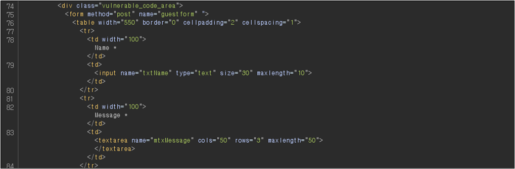 ์์ HTML ์ฝ๋๋ฅผ ์ดํด๋ณด๋ฉด Name(txtName)์ ๊ฒฝ์ฐ ์์ฑ ๊ฐ๋ฅํ ์ต๋ ๊ธธ์ด(maxlength)๊ฐ 10์ผ๋ก ์ค์ ๋์ด ์๊ณ , Message(txtMessage)์ ๊ฒฝ์ฐ ์์ฑ ๊ฐ๋ฅํ ์ต๋ ๊ธธ์ด(maxlength)๊ฐ 50์ผ๋ก ์ค์ ๋์ด ์๋ ๊ฒ์ ํ์ธํ ์ ์๋ค.