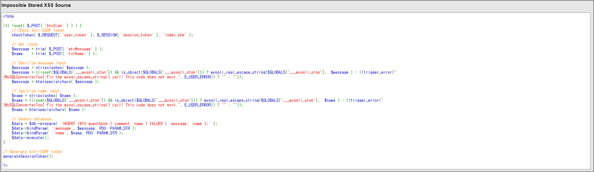 ์์ ๊ฐ์ด htmlspecialchars๋ฅผ ์ด์ฉํ์ฌ ์ ๋ ฅ ๊ฐ์ HTML Entity๋ก ๋ณํํ๋ค. ์ฆ, Impossible ๋ ๋ฒจ์ ๊ฒฝ์ฐ XSS๊ฐ ๋ถ๊ฐ๋ฅํ๋ค๋ ๊ฒ์ ํ์ธํ ์ ์๋ค.