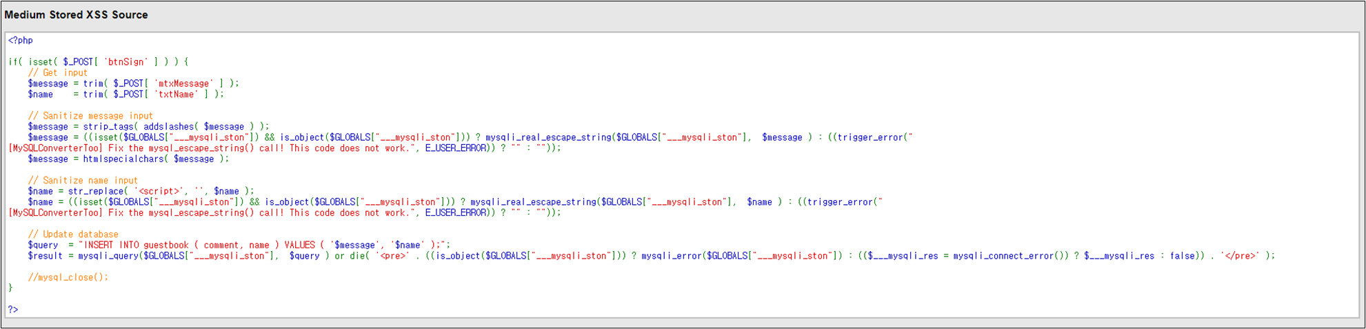 ์์ ๊ฐ์ด Name์์๋ <script>๋ผ๋ ๋ฌธ์์ด๋ง ๊ณต๋ฐฑ๋ฌธ์๋ก ์นํํ๊ณ ์๊ณ , Message์ ๊ฒฝ์ฐ์๋ strip_tags๋ผ๋ ํจ์๋ฅผ ์ด์ฉํ์ฌ ๋ชจ๋ <tag>๋ฅผ ์ญ์ ํ๊ณ ์๋ ๊ฒ์ ํ์ธํ ์ ์๋ค. ๊ทธ๋์ < ' " >๊ฐ ํ๊ทธ๋ก ์ทจ๊ธ๋์ด ์ญ์ ๋ ๊ฒ์ด๋ค. ๊ทธ๋ฌ๋ฏ๋ก Medium ๋ ๋ฒจ์ ๊ฒฝ์ฐ Message์ ๋ํด์๋ XSS๊ฐ ๋ถ๊ฐ๋ฅํ๊ณ , Name์ ๋ํด์๋ง XSS๊ฐ ๊ฐ๋ฅํ๋ค๊ณ ํ๋จํ๊ณ ์งํํ๋ค.