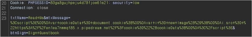 ๊ณต๊ฒฉ์์ ์ฃผ์๋ RequestBin์ ์ด์ฉํ ๊ฒ์ด๋ค. ๊ณต๊ฒฉ์์ ์ฃผ์๋ก ์ฟ ํค ๊ฐ์ ๋ณด๋ด๋๋กํ๋ script๋ ๋ค์๊ณผ ๊ฐ๋ค.