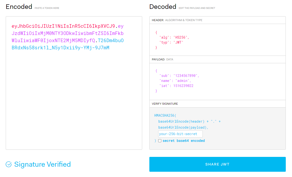 ํ๋จ์ ํ ์คํธ๊ฐ ํ๋์์ผ๋ก Signature Verified ๋ผ๊ณ ๋จ๋ฉด JWT ํ ํฐ์ด ๊ฒ์ฆ๋์๋ค๋ ๊ฒ !