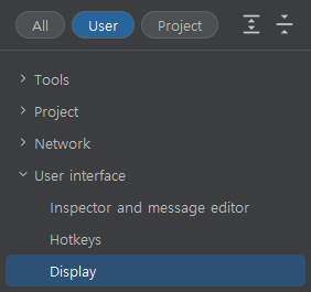 - ์ค์ (Setting) -> ์ ์ (User) -> ์ ์ ์ธํฐํ์ด์ค(User interface) -> ๋์คํ๋ ์ด -> ๋คํฌ ํ ๋ง / ํฐํธ ์ฌ์ด์ฆ