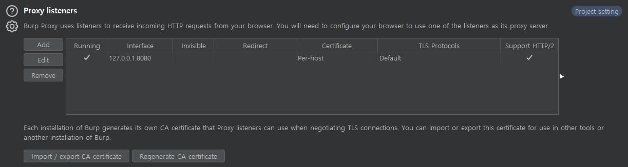 - ์ค์ (Setting) -> All -> Tools -> ํ๋ก์(Proxy) -> ํ๋ก์ ๋ฆฌ์ค๋(Proxy Listener)
