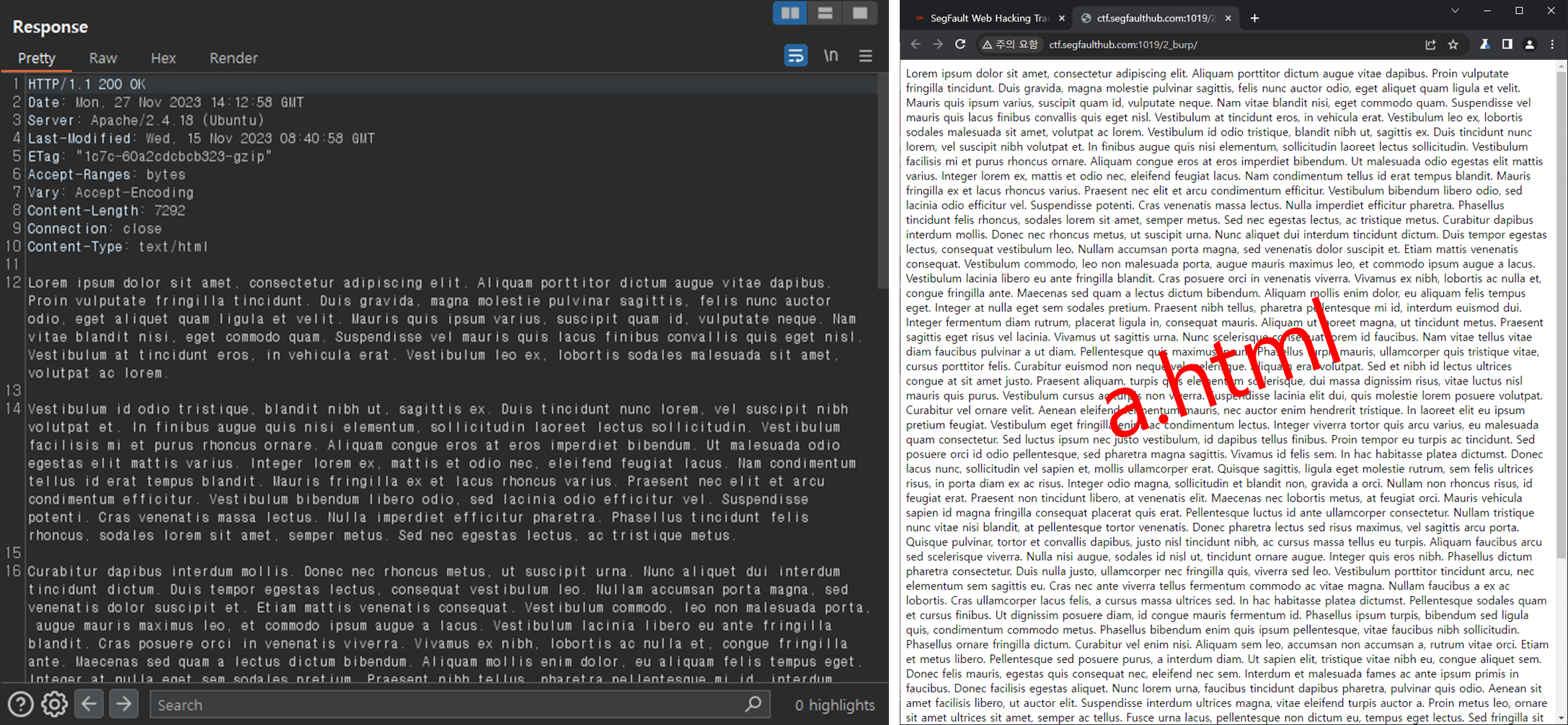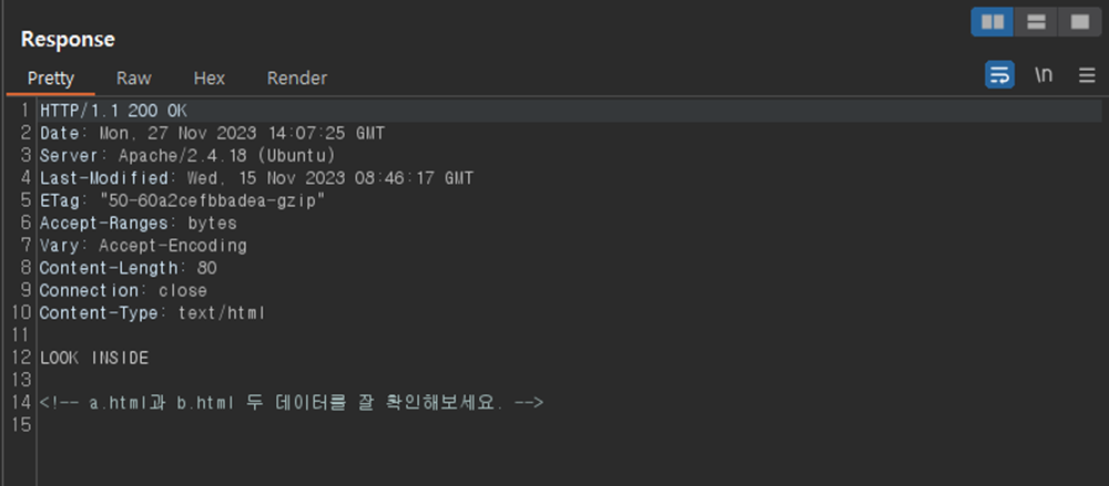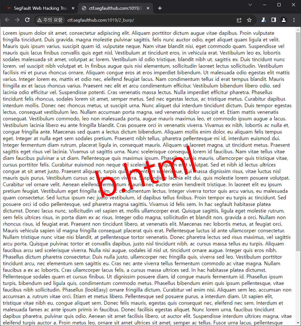- ์์ฒญ(Request)์ ๊ฒฝ๋ก GET /2_burp/ ์ a.html๊ณผ b.html์ ๋ฃ์ด ๋ฐ์ดํฐ๋ฅผ ํ์ธํด์ผ ํจ์ ์ ์ ์๋ค.