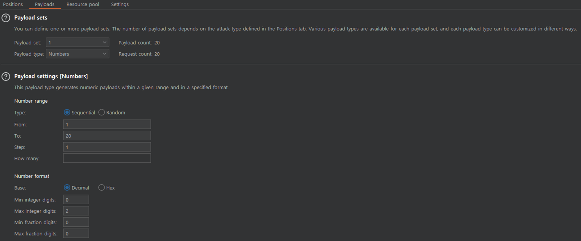 3. Brute Force๋ฅผ ์ํํ๊ธฐ ์ํ Payload๋ฅผ ์ค์ ํ๋ค.