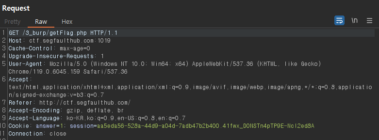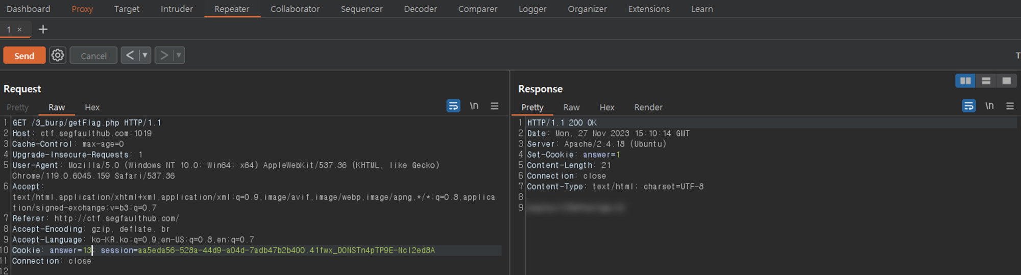 - ์ฟ ํค(Cookie) ๋ถ๋ถ์ session ์์ answer=1 ์ด ์๊ธด ๊ฒ์ ํ์ธํ ์ ์๋ค.