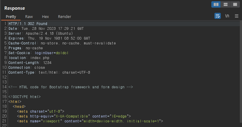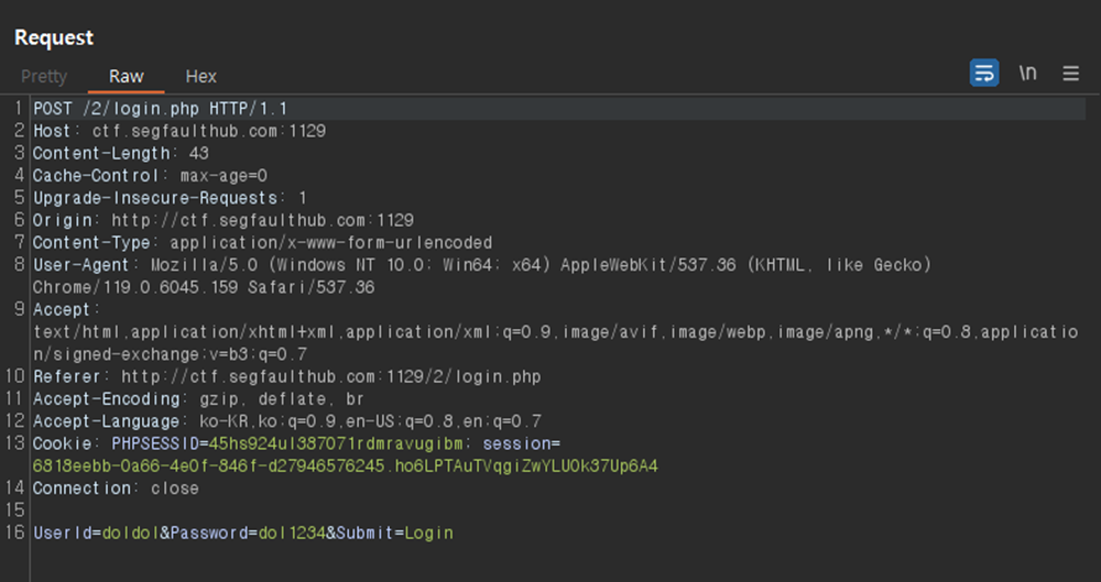 - ์์ฒญ(Requset)์์ POST ๋ฉ์๋๋ฅผ ์ด์ฉํ์ฌ /2/login.php ๊ฒฝ๋ก์ UserId=doldol&Password=dol1234&Submit=Login๋ฅผ ๋ณด๋ด๋ ๊ฒ์ ํ์ธ ๊ฐ๋ฅํ๋ค.