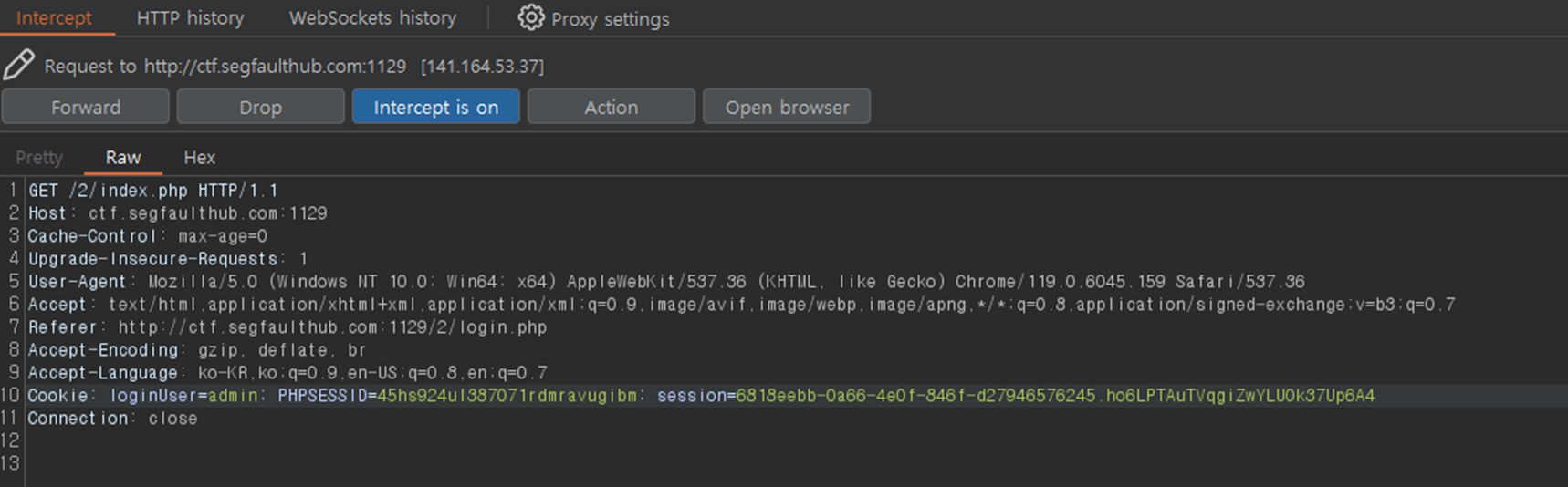 3. Intercept ์์ loginUser=admin ๋ก ๊ณ ์ณ์ค ํ Forward ํด์ค๋ค.