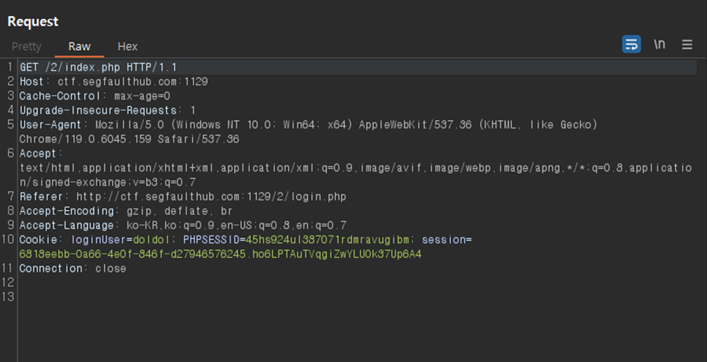์์ฒญ(Request)์์ Cookie: loginUser=doldol; PHPSESSID=45hs924ul387071rdmravugibm; session=6818eebb-0a66-4e0f-846f-d27946576245.ho6LPTAuTVqgiZwYLUOk37Up6A4 ๋ฅผ ํ์ธ ๊ฐ๋ฅํ๋ค.