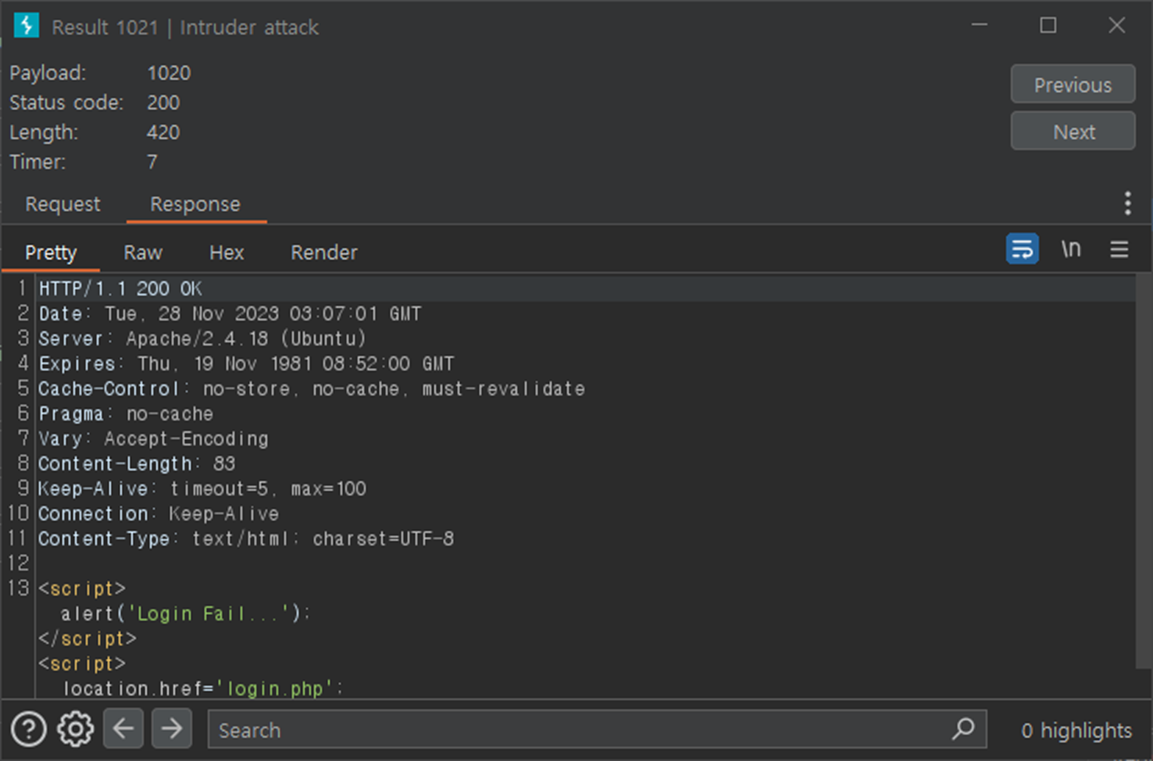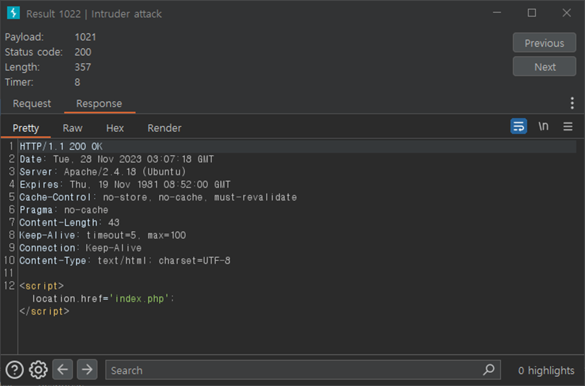 - 1021(์ค๋ฅธ์ชฝ) ์์ Login Fail์ด ์๋ index.php๋ก ๋ฆฌ๋๋ ์ ๋๋ ๊ฒ์ ํ์ธํ ์ ์๋ค.