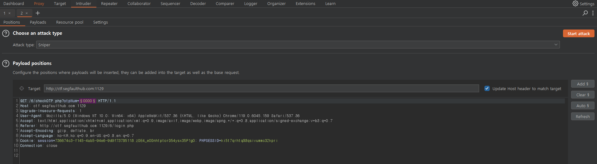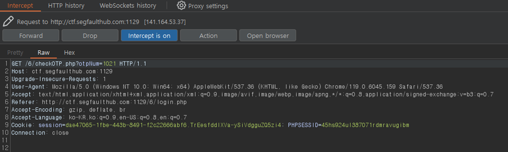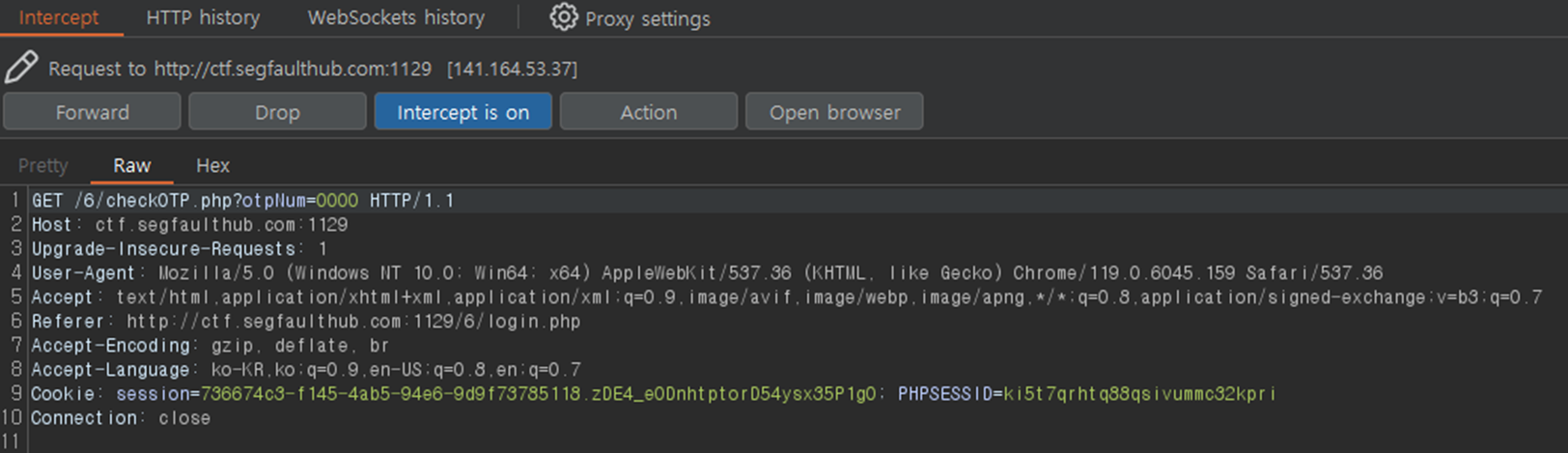 - Intercept ์์ GET /6/checkOTP.php?otpNum=0000 ํ์ธํ ์ ์๋ค.