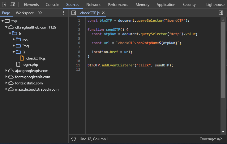 2. ๊ฐ๋ฐ์ ๋ชจ๋(DevTools)์์ checkOTP.js๋ฅผ ํ์ธํด๋ณธ๋ค.