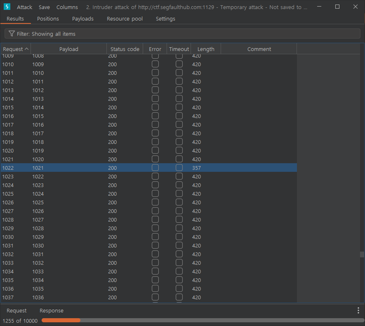 - ๋ฌด๋ฃ ๋ฒ์ Burp Suite์ด๊ธฐ ๋๋ฌธ์ ๋๋ฌด๋๋ ๋๋ฆฌ๋ค๋ ๋ฌธ์ ๊ฐ ์๋ค.