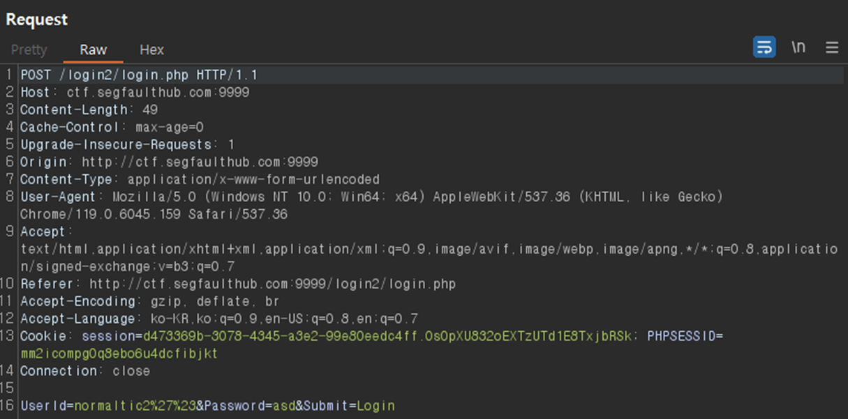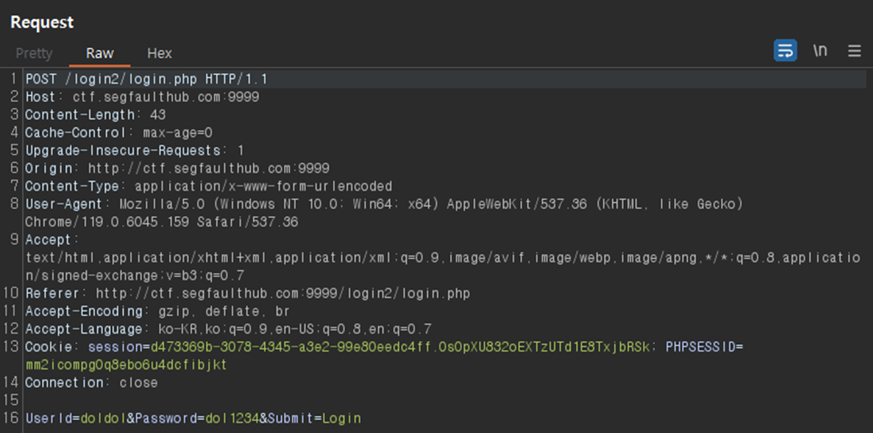- /login2/login.php ๊ฒฝ๋ก์ post๋ฉ์๋๋ก ํ๋ผ๋ฏธํฐ UserId=doldol&Password=dol1234&Submit=Login ๋ค์ด๊ฐ๋ ๊ฒ์ ํ์ธํ ์ ์๋ค.