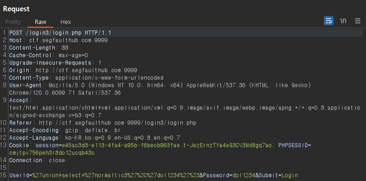 - /login3/login.php ๊ฒฝ๋ก์ post ๋ฉ์๋๋ก ํ๋ผ๋ฏธํฐ UserId=doldol&Password=dol1234&Submit=Login๊ฐ ๋ค์ด๊ฐ๋ ๊ฒ์ ํ์ธํ ์ ์๋ค.