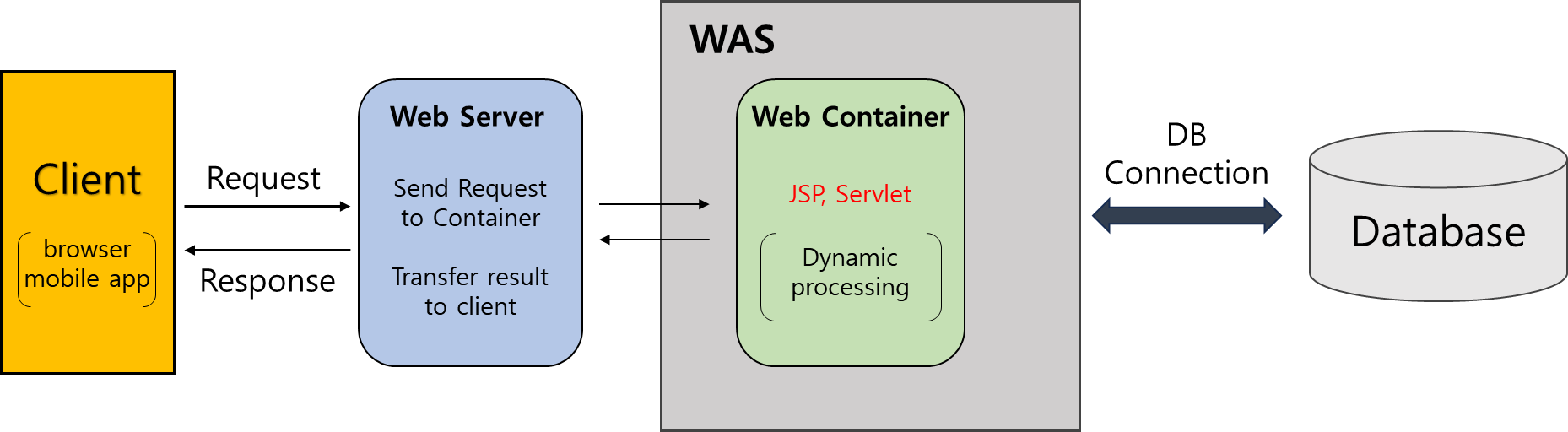 ์น์ ๋์ ๋ฐฉ์(๊ตฌ์กฐ) Web Client ์น ํด๋ผ์ด์ธํธ - ์ฌ์ฉ์๊ฐ ์น์ ์ ๊ทผํ๋ ํ๋ก๊ทธ๋จ ์ผ๋ฐ์ ์ผ๋ก IE, Chrome ๋ฑ๊ณผ ๊ฐ์ ์ฐ๋ฆฌ๊ฐ ์๊ณ ์๋ ์น ๋ธ๋ผ์ฐ์ ๋ค์ ๋๋ถ๋ถ ์น ํด๋ผ์ด์ธํธ๋ผ๊ณ ํจ Web Server ์น ์๋ฒ - ์น ํ์ด์ง, ์ฌ์ดํธ ๋๋ ์ฑ์ ์ ์ฅํ๋ ํ๋ก๊ทธ๋จ ์น ๋ธ๋ผ์ฐ์ ๋ฅผ ํตํด ํด๋ผ์ด์ธํธ๋ก๋ถํฐ HTTP ์์ฒญ์ ๋ฐ์ ์ ์ ์ธ ์ปจํ ์ธ (.html, .jpeg, .css, etc.)๋ฅผ ์ ๊ณต HTTP ํ๋กํ ์ฝ์ ๊ธฐ๋ฐ์ผ๋ก ํด๋ผ์ด์ธํธ(์น ๋ธ๋ผ์ฐ์ , ์น ํฌ๋กค๋ฌ)์ ์์ฒญ์ ์๋น์ค ์ ์ ์ธ ์ปจํ ์ธ ์ ๊ณต WAS๋ฅผ ๊ฑฐ์น์น ์๊ณ ๋ฐ๋ก ์์ ์ ๊ณต ๋์ ์ธ ์ปจํ ์ธ ์ ๊ณต์ ์ํ ์์ฒญ ์ ๋ฌ ํด๋ผ์ด์ธํธ์ ์์ฒญ(Request)์ WAS์ ๋ณด๋ด๊ณ , WAS๊ฐ ์ฒ๋ฆฌํ ๊ฒฐ๊ณผ๋ฅผ ํด๋ผ์ด์ธํธ์๊ฒ ์๋ต(Response) ํด๋ผ์ด์ธํธ(Clie..