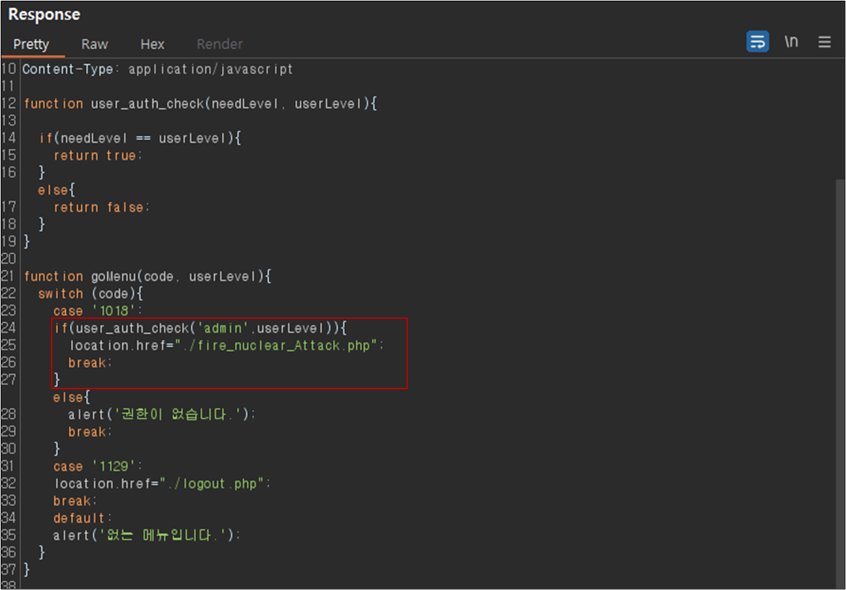 js๋ฅผ ์ด์ฉํ์ฌ location.href="./fire_nuclear_Attack.php"; ๋ถ๋ถ์ด ๊ด๋ฆฌ์ ๊ถํ์ด ์์ ๋๋ง ์์ฒญํ๋๋ก ๋์ด ์๋ค.