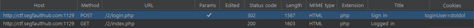 - ์์ฒญ(Requset)์์ POST ๋ฉ์๋๋ฅผ ์ด์ฉํ์ฌ /2/login.php ๊ฒฝ๋ก์ UserId=doldol&Password=dol1234&Submit=Login๋ฅผ ๋ณด๋ด๋ ๊ฒ์ ํ์ธ ๊ฐ๋ฅํ๋ค.