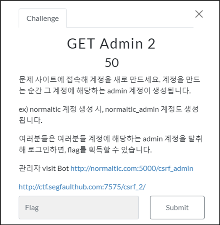 [SegFault] (CSRF) GET Admin 3 admin ๊ณ์ ์ ํ์ทจํด ๋ก๊ทธ์ธํ๋ฉด, flag๋ฅผ ํ๋ํ ์ ์์ต๋๋ค. ๋ฌธ์ ํ์ ๋ณธ ๋ฌธ์ ์ ๊ฒฝ์ฐ CSRF ์ทจ์ฝ์ ์ ์ด์ฉํ์ฌ ๋น๋ฐ๋ฒํธ๋ฅผ ์ํ๋ ๋น๋ฐ๋ฒํธ๋ก ๋ณ๊ฒฝํ๋ ์คํฌ๋ฆฝํธ๋ฅผ ์ฝ์ ํ๊ณ , ๊ด๋ฆฌ์ visit Bot์ ํด๋น ๋งํฌ๋ฅผ ์ ๋ ฅํ์ฌ admin ๊ณ์ ์ ๋น๋ฐ๋ฒํธ๋ฅผ ๋ณ๊ฒฝํ์ฌ ํด๋น ๊ณ์ ์ผ๋ก ๋ก๊ทธ์ธํ๋ฉด flag๊ฐ ๋์ค๋๋ก ์ด๋ฃจ์ด์ ธ์๋ค. ์ฐ์ ์์ ๊ด๋ฆฌ์ visit Bot ๋งํฌ์ ์ ์ํ๋ฉด ๋ค์๊ณผ ๊ฐ์ ํ์ด์ง๊ฐ ๋์จ๋ค. ํ์๊ฐ์ ํ id์ ๋ค์ _amdin์ ๋ถ์ฌ๋ฃ์ id๊ฐ ๊ณต๊ฒฉํ id ์ด๋ค. ex) gear -> gear_admin ๊ณต๊ฒฉํ ์์ด๋์ CSRF ๊ณต๊ฒฉ ์ ๋ณด๊ฐ ๋ด๊ฒจ์๋ URL์ ์ ๋ ฅํ๋ฉด ํด๋น ์์ด๋์ ๋น๋ฐ๋ฒํธ๊ฐ ๋ณ๊ฒฝ๋๊ฒ ๋๋ค. ๋ฌธ์ ๋งํฌ์ ์ ์์ ํด๋ณด๋ฉด ๋ค..
