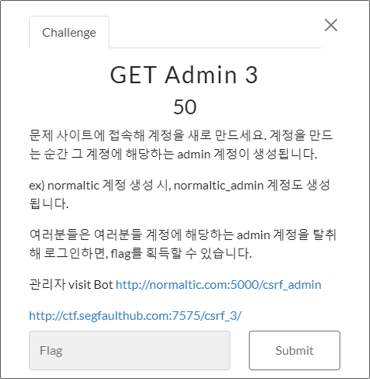 [SegFault] (CSRF) GET Admin 3 admin ๊ณ์ ์ ํ์ทจํด ๋ก๊ทธ์ธํ๋ฉด, flag๋ฅผ ํ๋ํ ์ ์์ต๋๋ค. ๋ฌธ์ ํ์ ๋ณธ ๋ฌธ์ ์ ๊ฒฝ์ฐ CSRF ์ทจ์ฝ์ ์ ์ด์ฉํ์ฌ ๋น๋ฐ๋ฒํธ๋ฅผ ์ํ๋ ๋น๋ฐ๋ฒํธ๋ก ๋ณ๊ฒฝํ๋ ์คํฌ๋ฆฝํธ๋ฅผ ์ฝ์ ํ๊ณ , ๊ด๋ฆฌ์ visit Bot์ ํด๋น ๋งํฌ๋ฅผ ์ ๋ ฅํ์ฌ admin ๊ณ์ ์ ๋น๋ฐ๋ฒํธ๋ฅผ ๋ณ๊ฒฝํ์ฌ ํด๋น ๊ณ์ ์ผ๋ก ๋ก๊ทธ์ธํ๋ฉด flag๊ฐ ๋์ค๋๋ก ์ด๋ฃจ์ด์ ธ์๋ค. ์ฐ์ ์์ ๊ด๋ฆฌ์ visit Bot ๋งํฌ์ ์ ์ํ๋ฉด ๋ค์๊ณผ ๊ฐ์ ํ์ด์ง๊ฐ ๋์จ๋ค. ํ์๊ฐ์ ํ id์ ๋ค์ _amdin์ ๋ถ์ฌ๋ฃ์ id๊ฐ ๊ณต๊ฒฉํ id ์ด๋ค. ex) gear -> gear_admin ๊ณต๊ฒฉํ ์์ด๋์ CSRF ๊ณต๊ฒฉ ์ ๋ณด๊ฐ ๋ด๊ฒจ์๋ URL์ ์ ๋ ฅํ๋ฉด ํด๋น ์์ด๋์ ๋น๋ฐ๋ฒํธ๊ฐ ๋ณ๊ฒฝ๋๊ฒ ๋๋ค. ๋ฌธ์ ๋งํฌ์ ์ ์์ ํด๋ณด๋ฉด ๋ค..